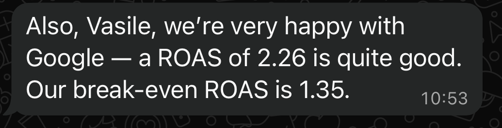 At the same time, later Vasile began helping ecommerce founders on the side to run Google ads through an ecommerce community called Ecommerce Scaling Secrets. As results and referrals grew, he moved from full-time employment to part-time and eventually left to build his own business.